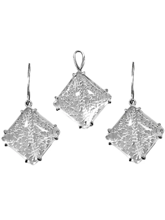 Sada stříbrných šperků. Módní náušnice a přívěsek ve tvaru diamantu s kubickou zirkonií. Materiál: Stříbro 925. Náušnice: Výška: cca 38 mm. Šířka: cca 22 mm. Zapínání: Anglické. Hmotnost: 6,53 g. Přívěsek: Výška: cca 20 mm. Výška se zapínáním: cca 26 mm. Šířka: cca 22 mm. Hmotnost: 2,95 g.